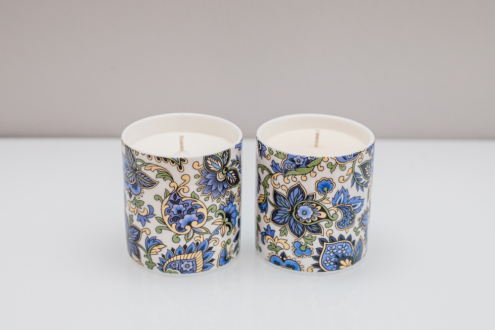 LIMITED EDITION – limited stock available – Small Pair of Medium Candles in Paisley Blue Bone China Holders.