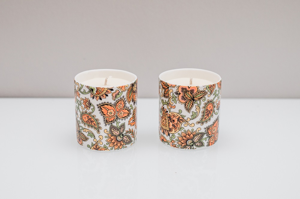 LIMITED EDITION – limited stock available – Pair of Medium Scented Candles in Paisley Orange Fine Bone China Holders.